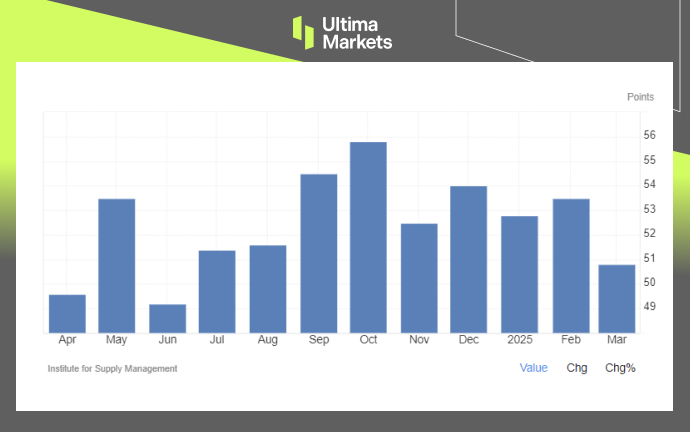 I confirm my intention to proceed and enter this website Please direct me to the website operated by Ultima Markets , regulated by the FCA in the United Kingdom2025年3月,美國ISM服務業採購經理人指數(PMI)從2月的53.5大幅下降至50.8。雖然該數值仍高於代表擴張的50門檻,但這標誌著過去九個月以來服務業增長最緩慢的一次。