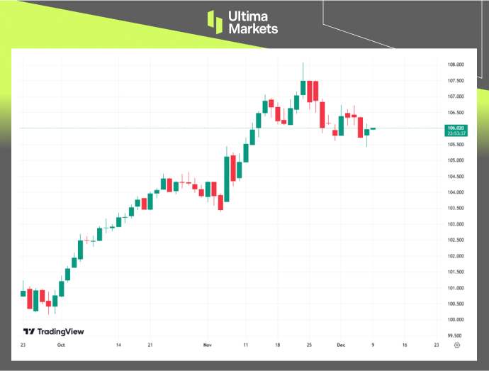 上周五,失業率上升反映了家庭就業數據的疲軟。用來衡量失業率的小型且波動較大的家庭調查顯示,就業人數減少了35.5萬人。相比之下,11月非農就業人數增加了22.7萬人,高于10月經上調後增加的3.6萬人(原先報告為1.2萬人)。因此,美元指數上漲0.23%,收于105.97。